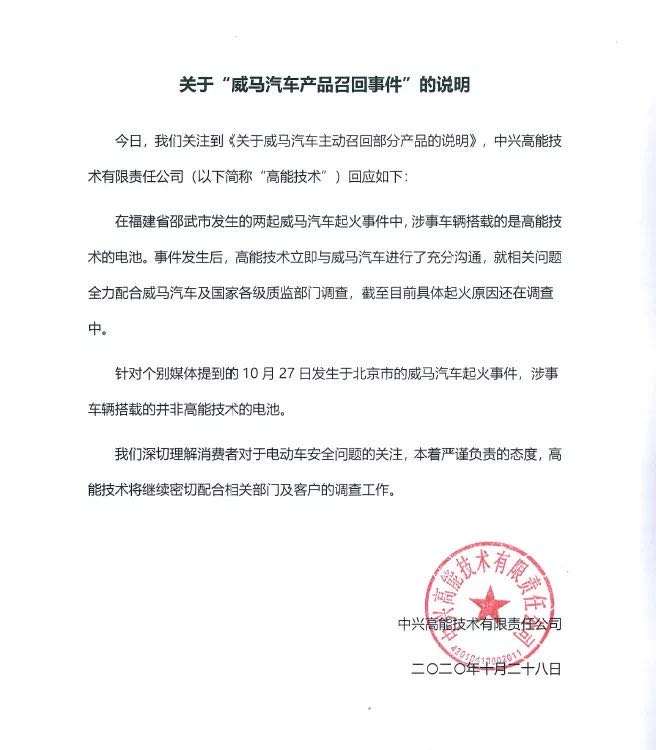 10月28日晚间,中兴高能发布公告承认,10月5日和13日的两起自燃车辆搭载的电池由中兴高能提供,但同时强调,10月27日发生在北京起火的威马EX5,涉事车辆搭载的并非高能技术的电池。