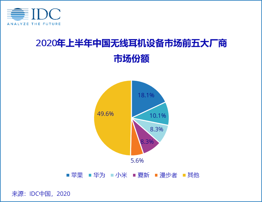 但至少在国内市场来说,苹果固然强势,却也无法吞下整个市场。根据IDC数据,今年上半年,国内无线耳机市场出货量4256万台,同比增长24%;真无线耳机占比64%,同比增长49%。苹果拿下了18.1%的市场份额,排名第一;华为、小米以10.1%、8.3%的份额分别拿下了第二和第三。但无线耳机这块市场,头部效应仍然不明显,仍有一半份额是被“其他”品牌拿下的,整个行业里仍然是一片混战的局面。对有实力的厂商来说,仍有发挥的余地。