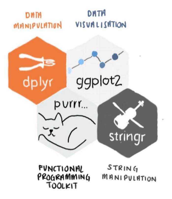我个人是从R数据科学开始接受R语言培训的,这门课程对R的tidyverse进行了相当详细的介绍,tidyverse是一个非常有用的数据处理包,可用来对数据进行组织、操作和可视化,其中最值得注意的包括ggplot2(用于数据可视化)、dplyr (用于数据操作)以及stringr (用于字符串操作)。