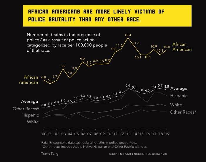 消化吸收完这本书之后,我创建一个视觉上(多少有点)令人愉悦的图表,来说明警察对黑人残酷对待的问题。通过这本书我学到的其中一个重要经验是要在需要的地方吸引别人的注意力。在这张图表里面我是通过这样的处理来实现的:用明亮的黄色线条来突出显示非裔美国人(让人联想起BLM的色调),同时确保图表的其余部分仍保留在背景之中,并辅以白色和灰色等暗一点的阴影。