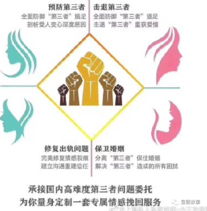 他们有着专业的团队,使用攻心、利诱、离间、甚至“美人计”来帮助委托人劝退“小三”,同时收取从几千到几十万不等的高昂服务费用。