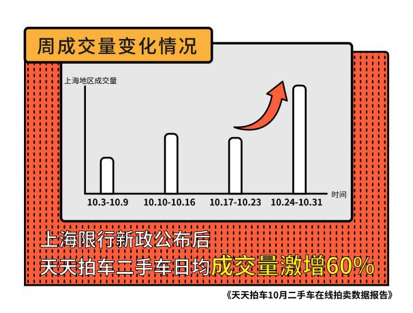 成交量涨幅最明显的地区是上海。10月24日,上海市发布的最新外牌限行政策规定:自11月2日起,上海内环高架上外牌限行时间加长;明年五一假期后,上海内环地面道路也将开始限时开放。