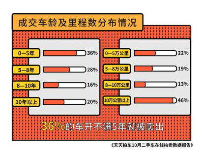 报告还显示,近年来车辆的置换周期不断缩短,二手车的成交车龄呈现出“低龄化”的态势,36%的二手车开不满5年便被卖出。在里程数方面,22%的车辆开不满5万公里就被卖出。