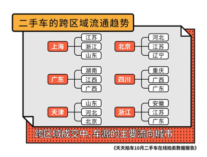 数据显示,今年10月,上海的二手车主要流向江苏、浙江、山东等地;北京的二手车主要流向河北、江苏、辽宁等地;广东的二手车主要流向湖南、江西、广西;四川的车源流向重庆、广西、广东;天津的车源流向山东、河北、北京;浙江的车源流向安徽、江苏、广东。