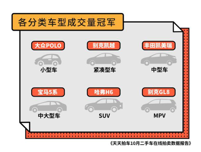 此外,在月度成交量排行榜中,大众POLO和别克凯越分别为小型车和紧凑型车的成交量冠军;在中型车和中大型车方面,成交量冠军分别是丰田凯美瑞和宝马5系;哈弗H6、别克GL8为SUV、MPV车型的成交量冠军。