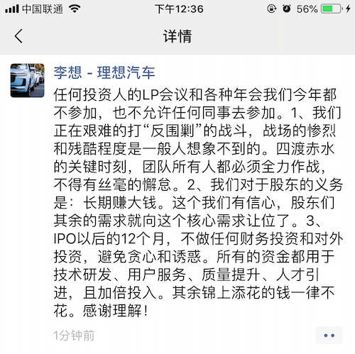 理想汽车创始人李想在朋友圈发文称:任何投资人的Lp会议和各种年会我们今年都不参加,也不允许任何同事去参加。李想表示,理想汽车正在艰难的打「反围剿」的战斗,战场的惨烈和残酷程度是一般人想象不到的。四渡赤水的关键时刻,团队所有人都必须全力作战,不得有丝毫的懈怠。