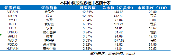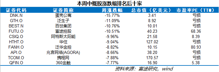 本周中概板块小幅下挫,相对美国三大股指的大跌表现来说,仍是十分坚挺的。