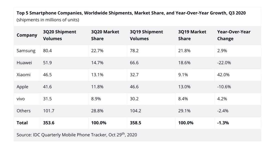 近日,IDC公布2020年第三季度全球智能手机市场出货量报告。