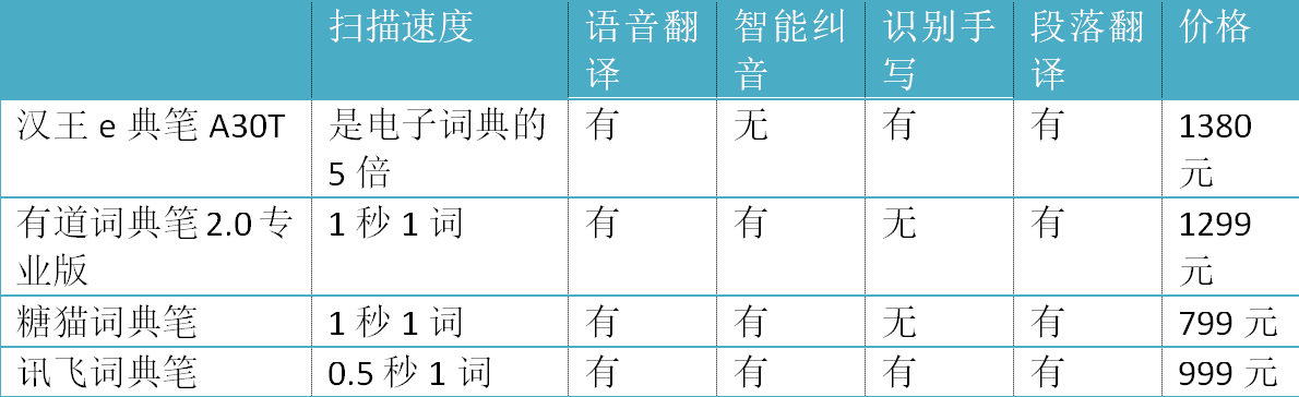 各大公司词典笔产品性能价格对比