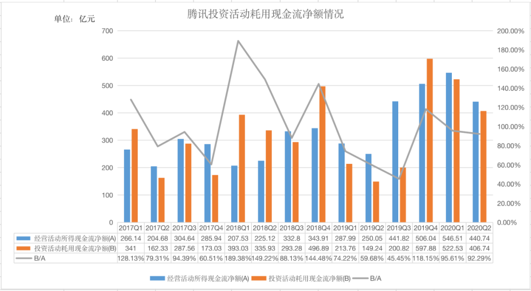 腾讯的投资活动耗用现金流净额/经营活动所得现金流净额也随之一直保持着较高的比例,2018年全年平均水平超100%。