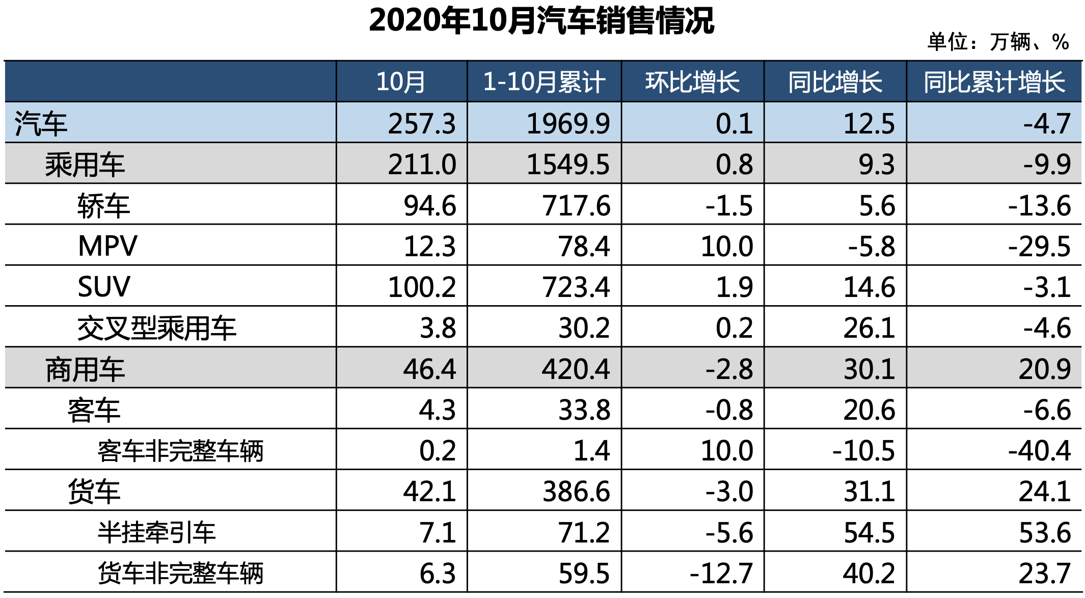 11月11日,中国汽车工业协会发布的最新销量数据显示,10月,汽车产销分别为255.2万辆和257.3万辆,环比分别增长0.9%和 0.1%,同比分别增长11.0%和12.5%。 目前汽车产销已连续7个月呈现正增长,连续6个月增速保持在10%以上。