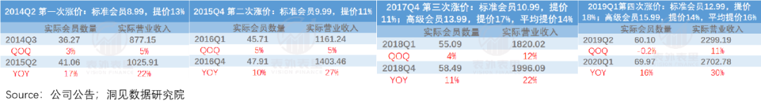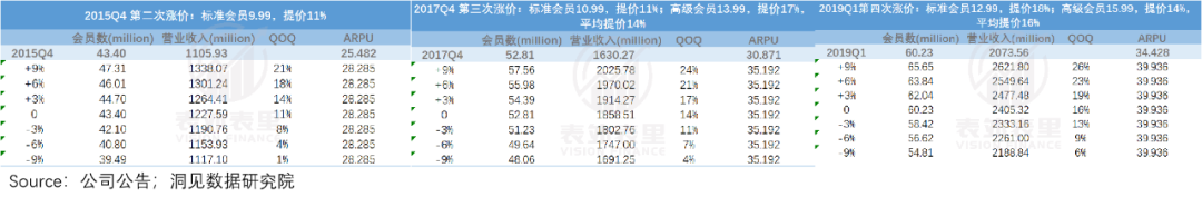同理,将奈飞2015Q4、2017Q4、2019Q1三次涨价情况套入到这个假设里,得出的结果与2014Q2大致相同:涨价和会员数的角力,最坏的情况也只是让平台的业绩增长放缓,却并没有出现下降。