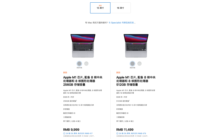 在苹果官网在售的 M1 芯片 MacBook Pro 起售价为 9999 元,与今年 5 月份更新的 MacBook Pro 2020 起售价持平。