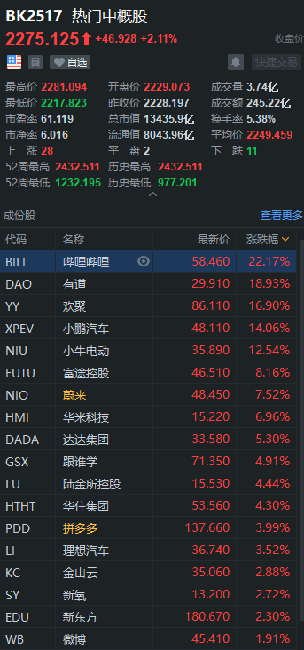 其他中概股中,逸仙电商涨75.24%;欢聚时代涨16.9%;小牛电动涨12.54%;中通快递跌7.98%;蛋壳公寓跌16.19%。