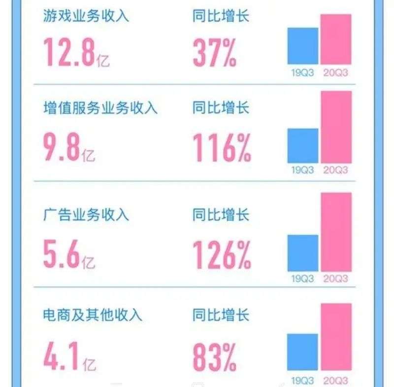 第三季度,B站的净收入总额达到人民币32.257亿元,较2019年同期增长74%,环比增长23%。其中,游戏业务收入12.8亿元,同比增长37%;增值服务业务收入9.8亿元,同比增长116%;广告业务收入5.6亿元,同比增长126%,会员和广告收入都超过了预期;电商及其他业务收入达4.1亿,同比增长83%。