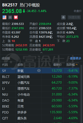 大型中概股中,阿里巴巴跌0.8%;百度涨1.22%;京东跌1.77%;网易跌3.81%;拼多多跌5.59%;趣头条跌4.69%;蔚来涨0.34%;哔哩哔哩跌1.32%;