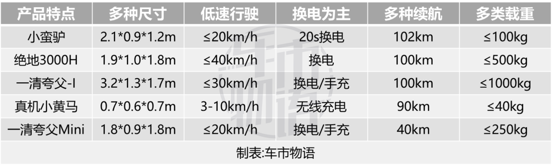 细细梳理当前市场的无人配送车辆产品图谱,可以总结出五大特点:1.多种尺寸;2.低速行驶;3.换电为主;4.多种续航;5.多类载重。