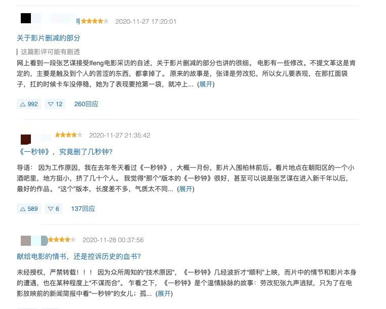 但让人遗憾的是,这是一封被删减过的情书。在电影之外,《一秒钟》另一个引起市场讨论的话题是,电影到底删减了哪些内容?豆瓣、微博、知乎等平台上已经出现了不少关于删减片段的讨论。在经历过两次“技术原因”撤档之后,《一秒钟》经历了一些细节修改与补拍,但删减部分模糊了电影中一些关键信息,如片中的劳改分子为何执着于通过看电影见女儿一面?