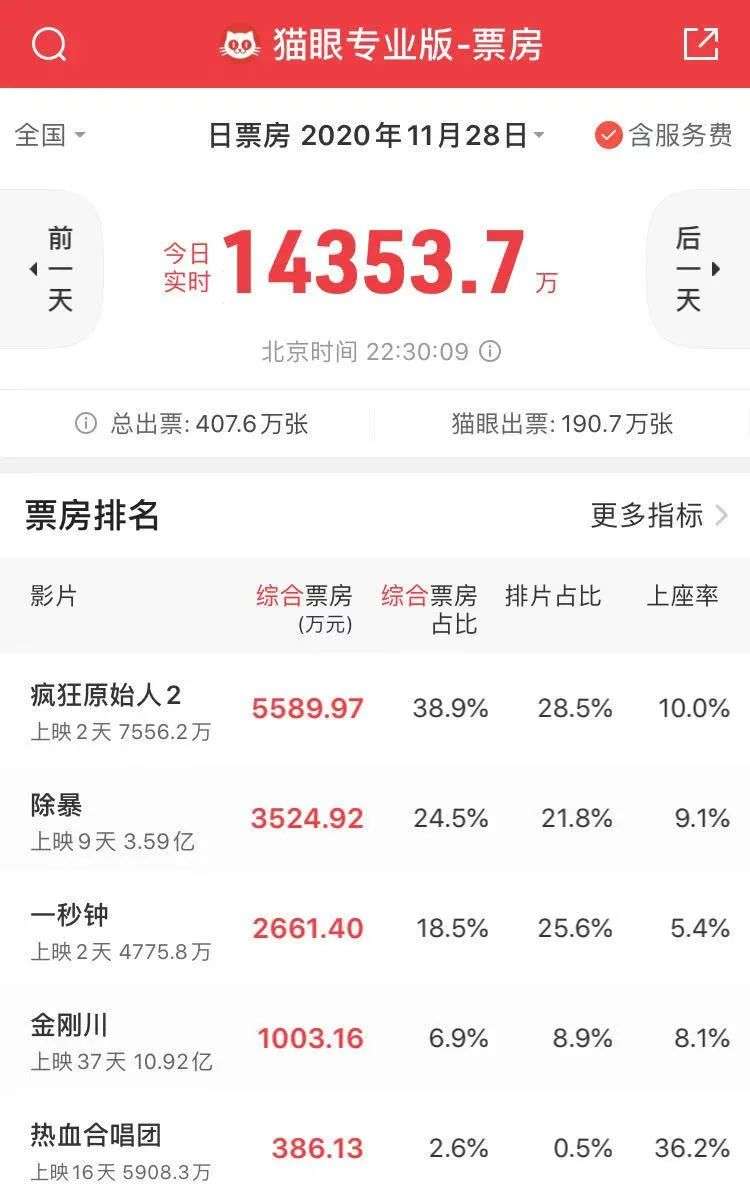 但是《一秒钟》累计仅4775万,首日上映单日票房被旧片《除暴》强压一头,而上映第二天,同期上映的环球影业动画电影《疯狂原始人2》开始发力,《一秒钟》票房空间再次被挤压,排片占比从首日31.2%下滑至现在的25.6%。