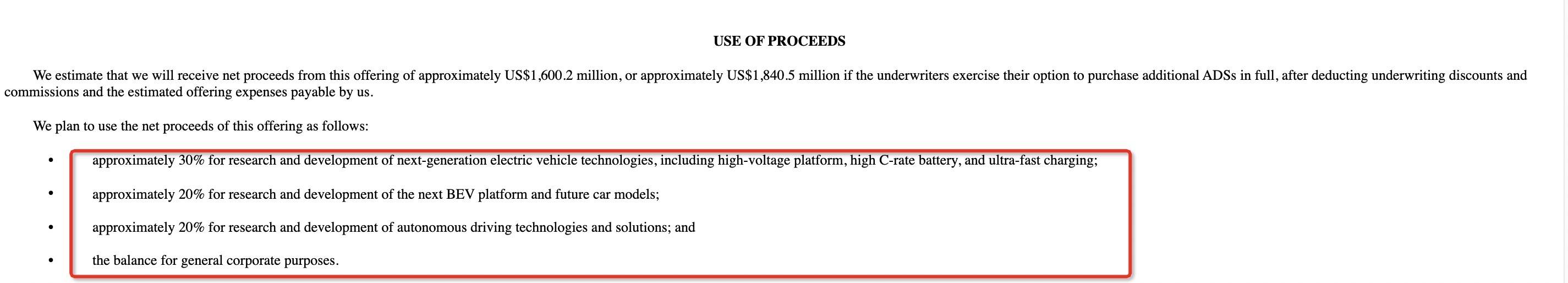 筹集资金用途;来源:理想汽车向SEC递交的文件截图