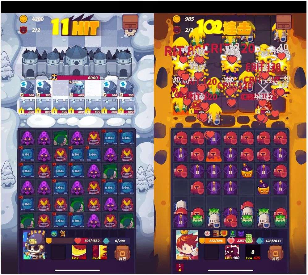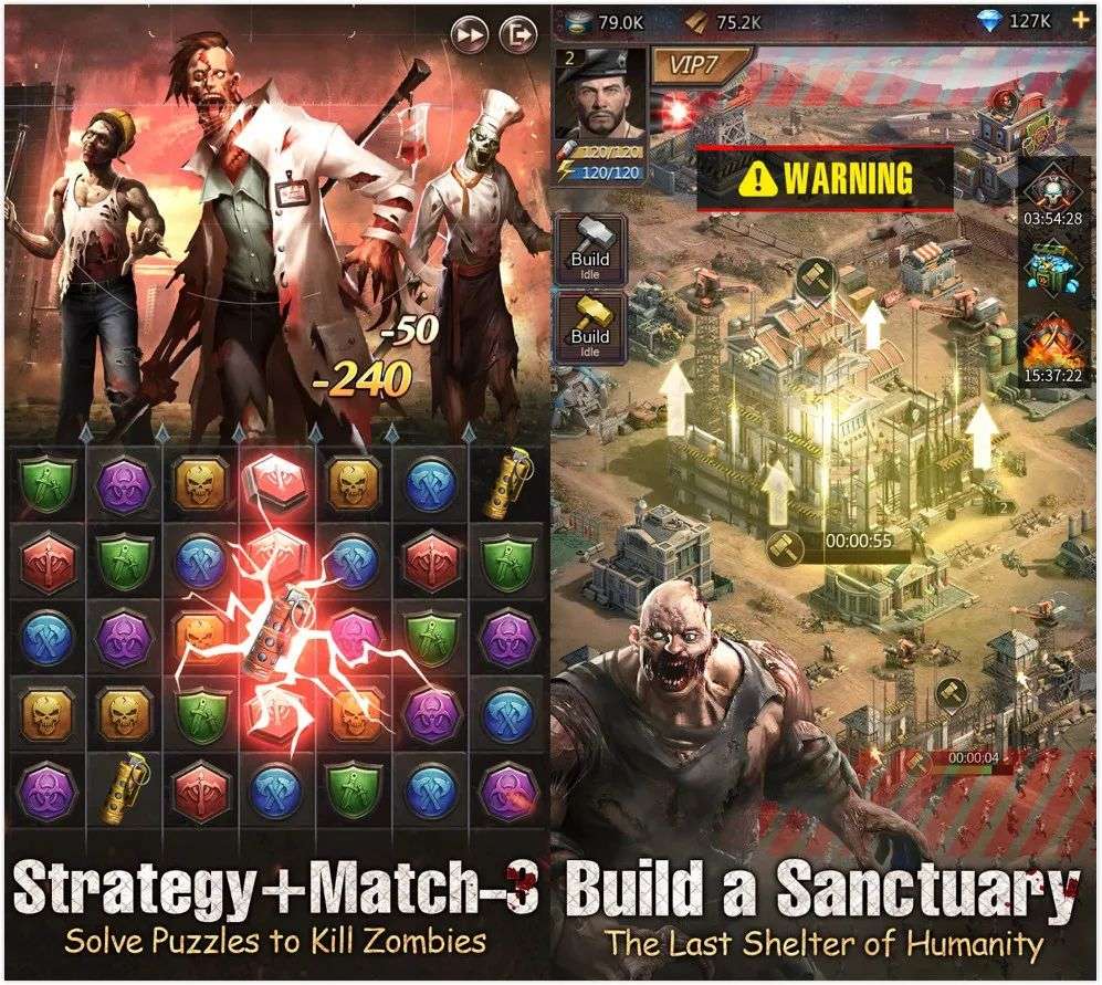 游戏选择以丧尸末日题材来包装、三消+战斗玩法来切入,这和传统的三消+模拟经营玩法形成了很大区别。玩家需要通过消除玩法作战积累资源,建立庇护所并招募英雄,升级强化后对抗更强的敌人。尽管产品噱头在三消,但《Puzzles & Survival》的内核和SLG基本相同,从体验上,这种“硬核”的三消更符合男玩家口味,这也有别于三消市场长期服务于女性用户的普遍认知。