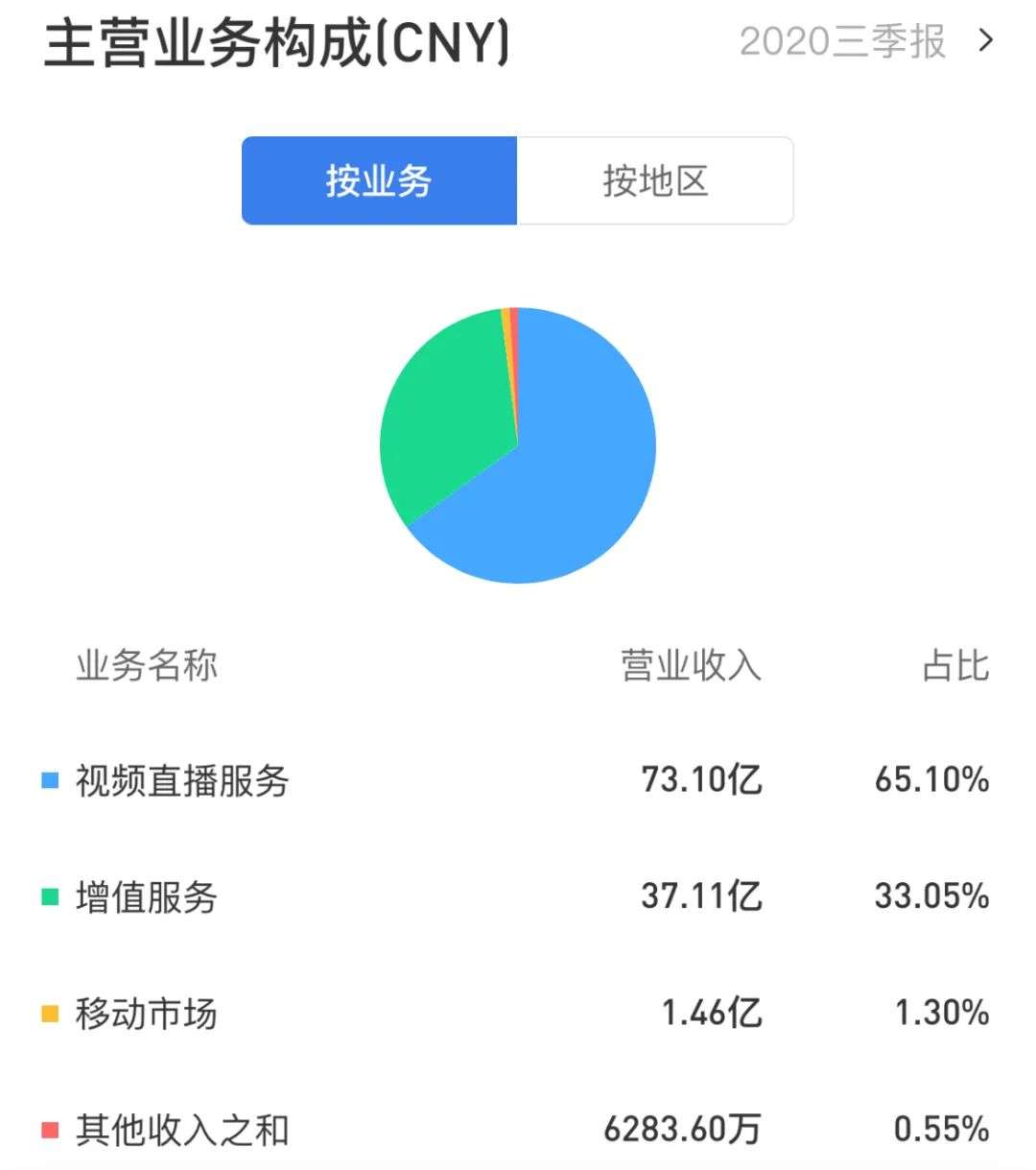 直播业务是陌陌的支柱业务。2019年、2020年Q1、2020年H1、2020年Q3,陌陌的视频直播服务在总营收中的占比分别为73.16%、64.88%、66.13%、65.10%,在移动市场和手机游戏两大业务上,陌陌一直未打开出口,两项业务贡献的业绩占比始终浮动在1%左右。单一的盈利结构和主营业务的下滑,让二级市场很难继续对陌陌买账。