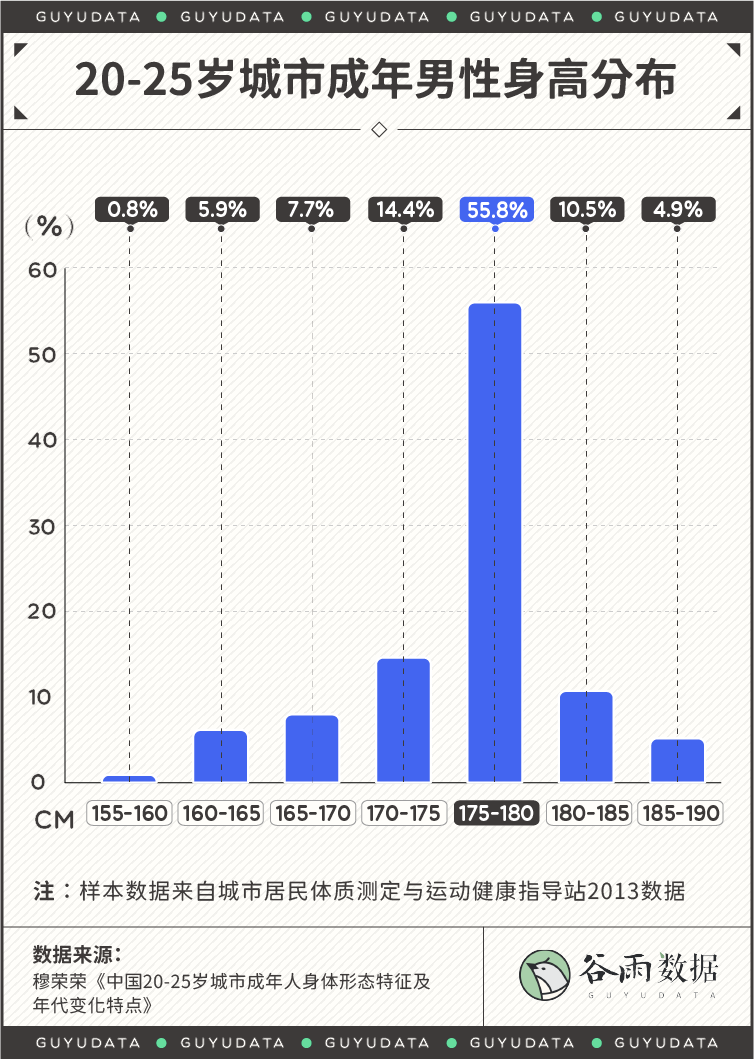 早在2013年,国家体育总局的城市居民体质调研显示,55.8%的20-25岁城市成年男性身高在175cm-180cm之间。