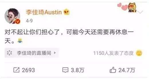 李佳琦今年直播场次以肉眼可见的速度在减少,曾经一年365天直播389场的他,截至10月22日,只播了185场。一部分原因是小助理付鹏的离开,另外一个重要原因是李佳琦的身体。因常年拼命,李佳琦身体出现了严重的损耗,有时不得不停播。