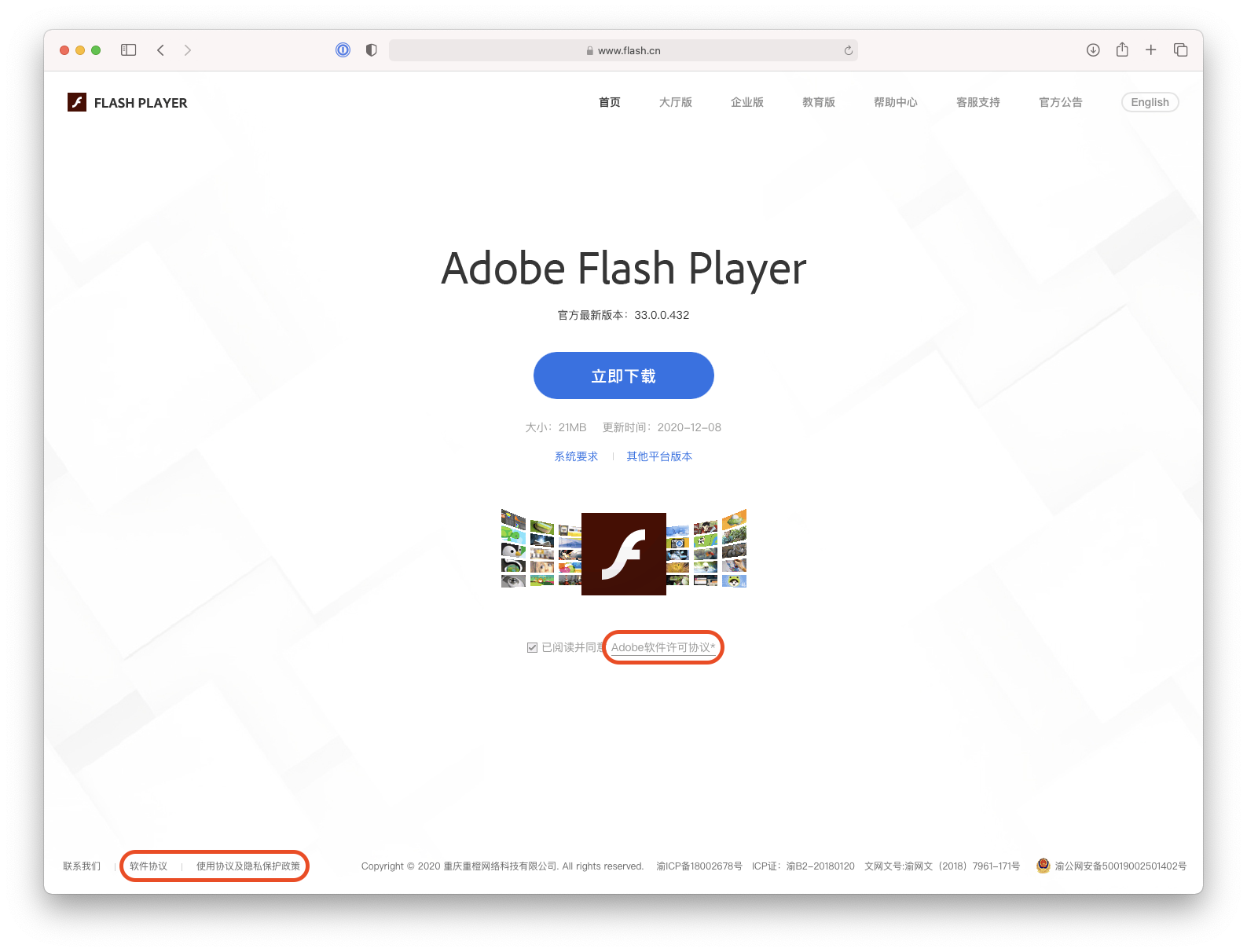 除此之外,2144的特供版Flash在使用时还需额外同意一个2144自己的用户协议,这个协议中明确表示「用户允许第三方广告」。可能是2144自己也没胆量将它放在下载按钮旁边询问用户是否同意,因此将它放在了下载页面的最底下,与「联系我们」放在了一起,祈求没有用户能看到。