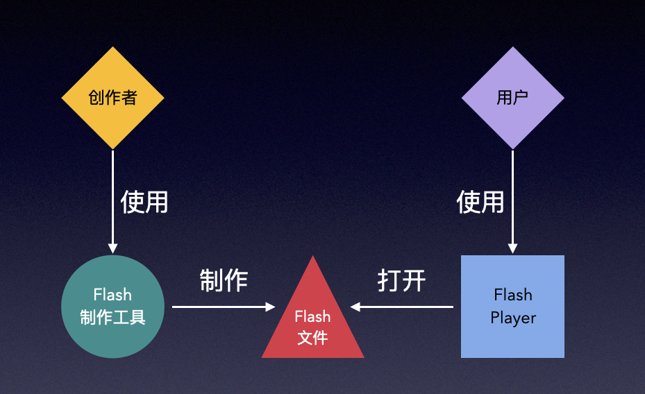 既然Flash这么好用,为什么Adobe会宣布明年将停止支持呢?这与Flash的运行机制有一定关系。虽然我们平时将其统称为Flash,但就像刚刚我提到的那样,Flash其实可以分为三个独立的部分——制作环境、内容文件和Flash播放器。它们三者的关系大家大致可以理解为: