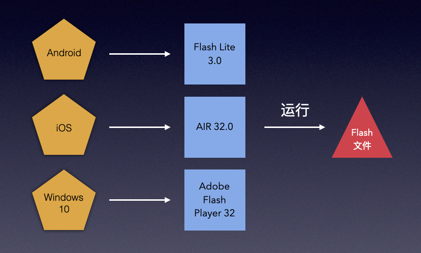 创作者用Adobe Flash(制作环境)制作了一个SWF文件(Flash文件),用户下载或缓存SWF文件后用电脑本地的Flash Player(播放器)运行。从某种意义上看,Flash Player就像是一个本地的虚拟机。