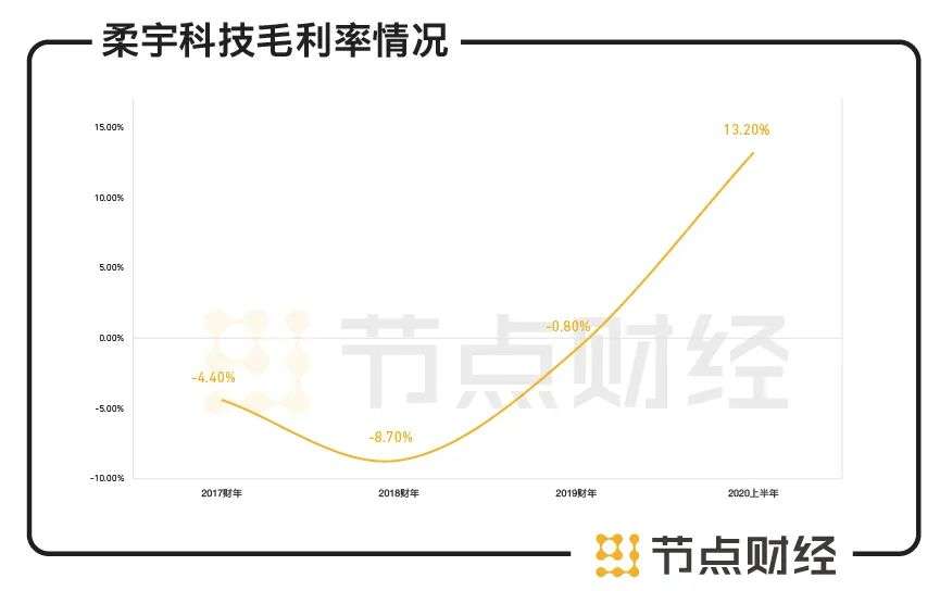 高昂的投入和销售不佳背后,柔宇科技整体毛利水平长期处于负毛利状态。2020年上半年其毛利转正,但也仅为13.2%,离支撑公司盈利还很遥远。