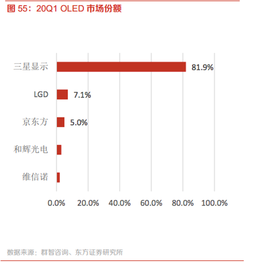 一方面,随着国内面板厂商 OLED 技术的成熟以及产能的释放,国产 OLED 面板逐步应用到了终端品牌的旗舰机中。另一方面,在全球OLED市场,目前三星份额一家独大,占比超过80%。随着国内面板厂商开始在主流智能手机品牌供应链的占比逐渐提升,国产 OLED 有望迎来发展机会。
