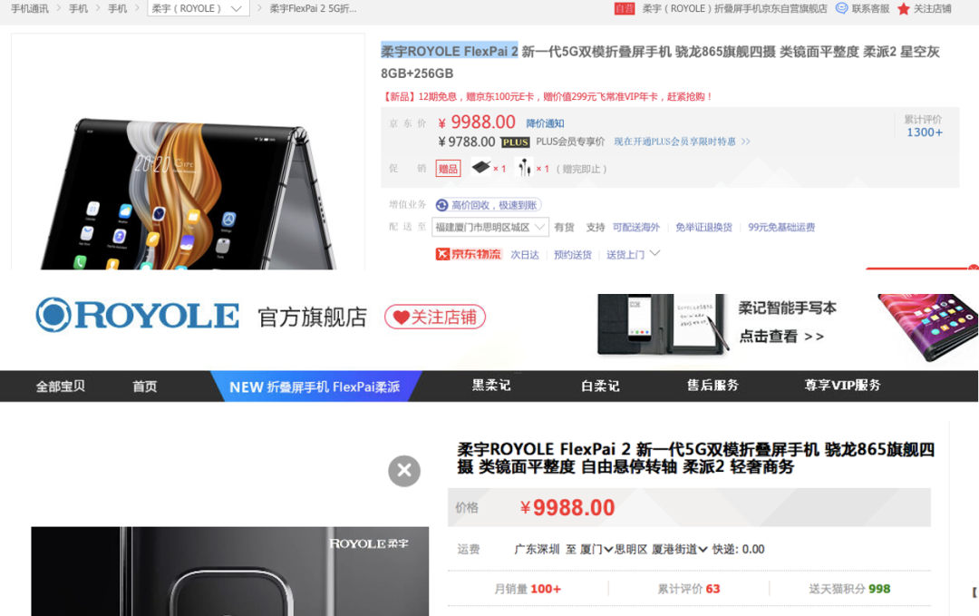 不过,从目前来看,柔宇手机的销量情况并不乐观。因为线下渠道较少,柔宇科技在各大电商平台的数据一定程度上能够反映其销售水平。以京东渠道为例,柔宇二代折叠屏手机ROYOLE FlexPai 2在京东自营旗舰店的评价约为1300条,在淘宝“柔宇数码旗舰店”的评价人数还不过百。而同样在万元以内的三星Galaxy Z Flip(SM-F7000)折叠屏手机在其京东旗舰店的评价则超过1万。柔宇科技手机的出货量与主流手机厂商还有较大差距。