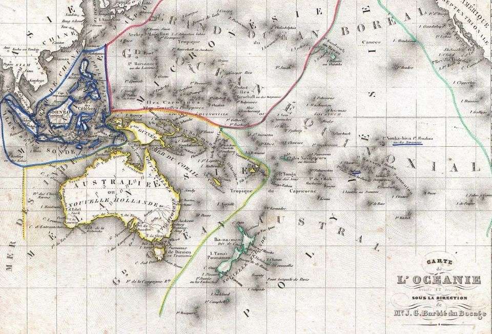 在这张1852年的太平洋地图里,欧洲人将太平洋划分成了3个地理区域