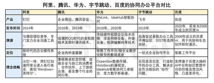 而我们把视野放宽到整个狼烟四起的协同办公平台市场,发现包括华为、百度、阿里等在内的互联网及通讯巨头都已经摩拳擦掌。