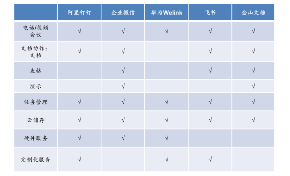 ▲部分协同办公应用平台的功能布局(图源东吴证券分析报告)