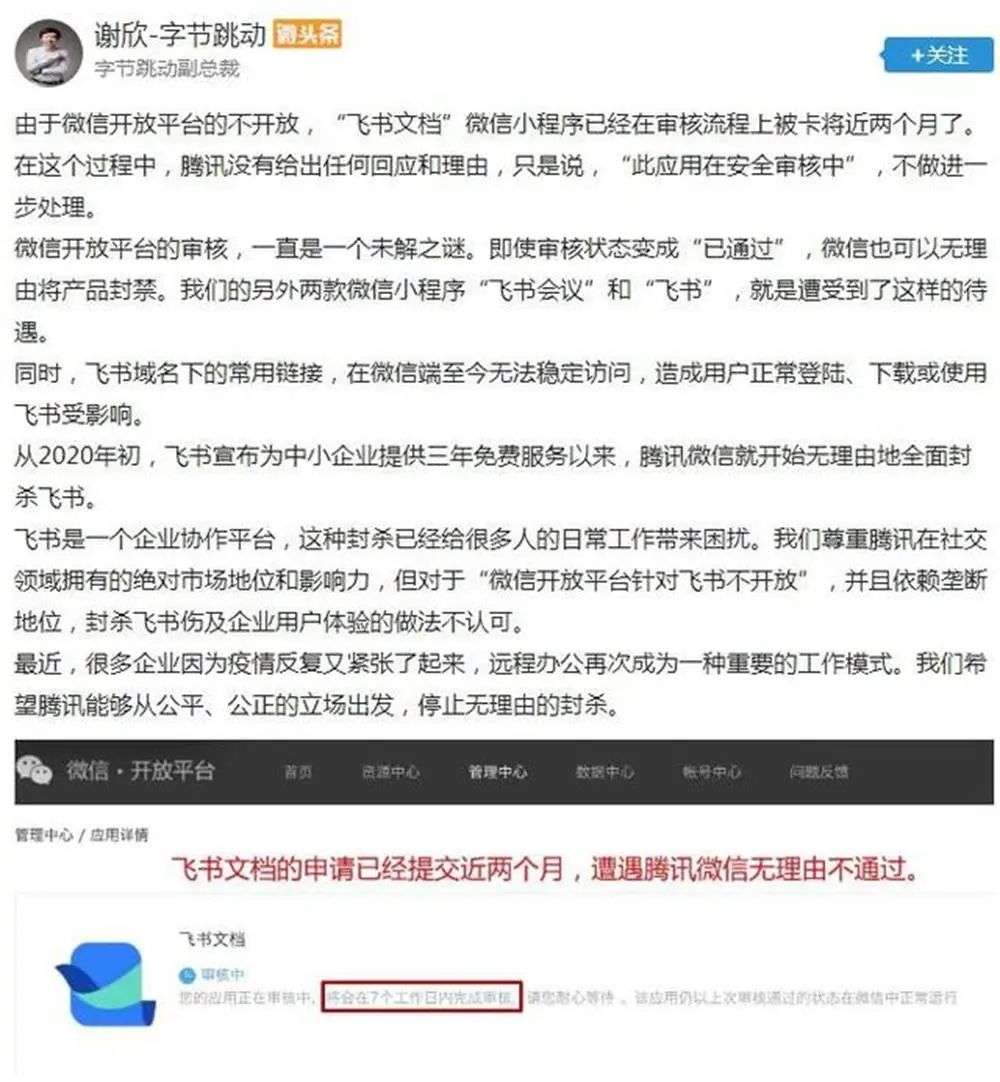 智东西1月8日报道,昨日下午,字节跳动副总裁谢欣在其头条号发文喊话腾讯,要求停止无理由封杀飞书,引起各界关注。谢欣称:“由于微信开放平台的不开放,‘飞书文档’微信小程序已经在审核流程上被卡将近两个月。”