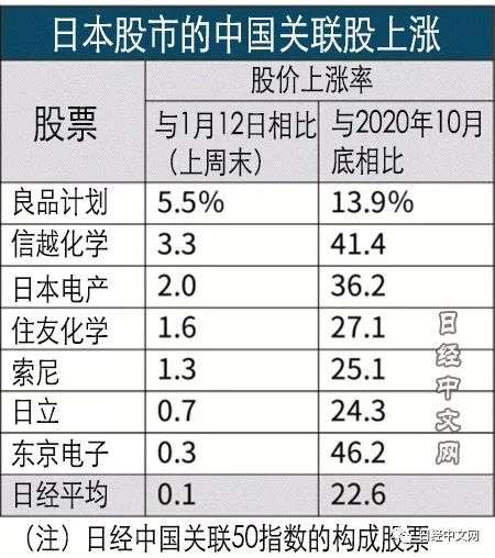 其中价格走势良好的是中国关联股票。1月12日,从日经中国关联50指数的成分股来看,信越化学工业和东京电子创下了上市以来新高。8日发布2020年9月~11月合并财报的良品计划的股票一度上涨14%。除了受益于日本国内的居家消费之外,中国大陆和台湾的日用百货销售也表现良好,该公司的净利润远远超过市场预测平均值(日本Quick Consensus数据)。