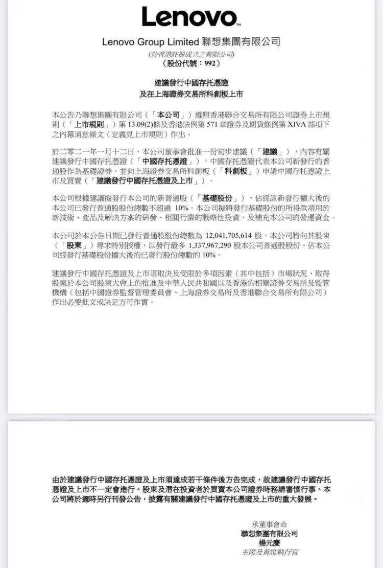 1月12日晚间,联想集团发布公告称,公司已向香港联合交易所有限公司提交公告,宣布董事会已批准可能发行中国存托凭证(CDR)、并向上海证券交易所科创板申请CDR上市及买卖的初步建议。公告称,根据该建议,联想集团拟发行新普通股, 占公司经扩大后的已发行普通股股份总数不多于10%。募得资金将用于技术、产品及解决方案的研发,相关产业战略投资,及补充公司营运资金。