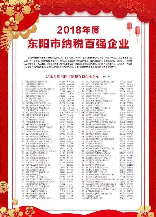 忽略网上满天飞的明星片酬,我找到一个比较权威的信息,东阳市2019年初发布过一个《2018年度东阳市纳税百强企业》