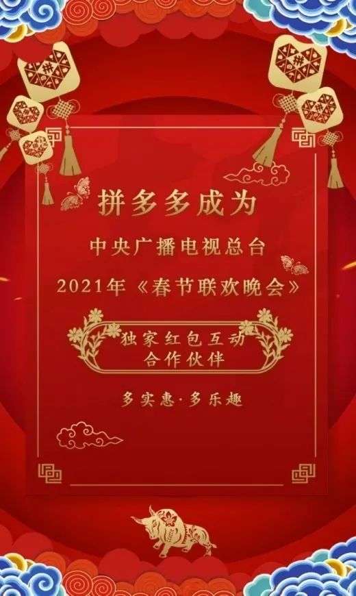 2020年9月24日,在央视品牌强国工程发布会上,正式宣布了新电商平台拼多多将会成为央视2021年《春节联欢晚会》的独家红包互动合作伙伴,一时间引起业内外的广泛关注。