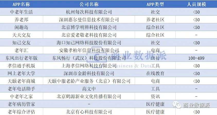 知己交友的情况在这个赛道十分普遍,通过将列表中的APP一一查询发现,这些玩家有原生的互联网小微企业,也有传统养老机构切入到互联网+的,但无一例外都属于中小企业。