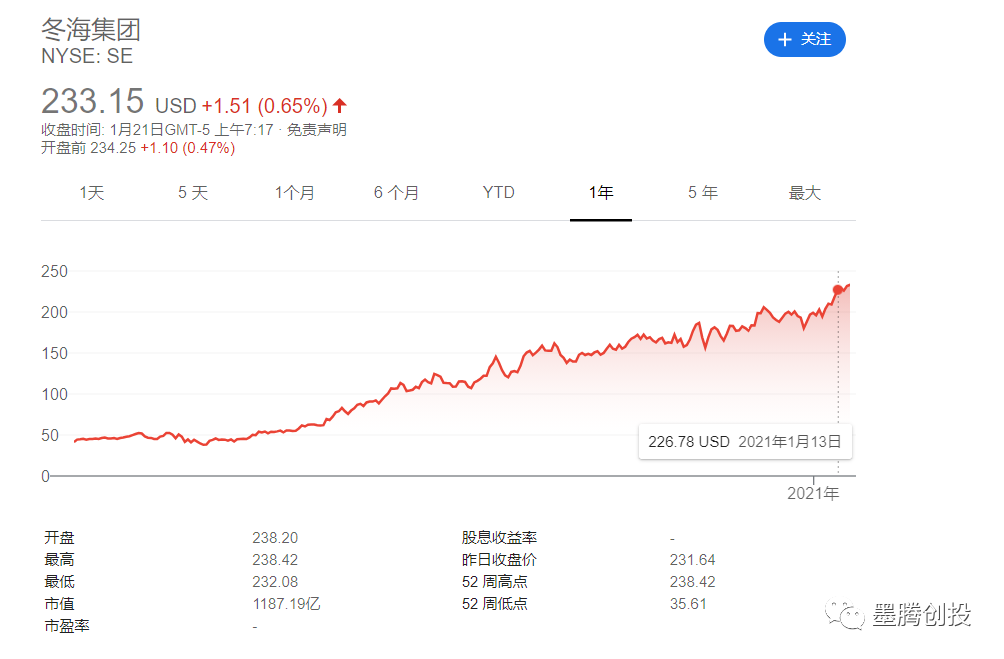 但此时上市是一个不错的选择,毕竟流动性泛滥和投资者情绪的双重加持下,现在二级市场十分火爆,例如受疫情冲击的爱彼迎在上市之后股价表现依旧坚挺 - 连印度的OTA Makemytrip的股价都复活了。而之前提到的隔壁的冬海集团,作为东南亚唯一在美上市的不是垃圾股的科技股,去年的股价更是“一骑绝尘”。