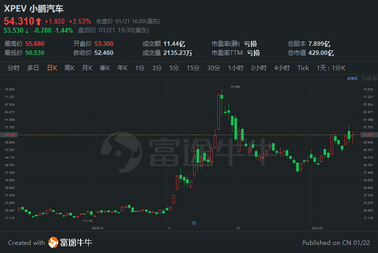小鹏汽车周四收涨3.53%,报54.31美元。