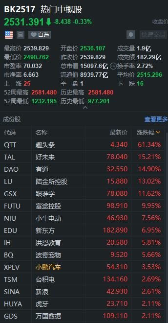 其他中概股方面,趣头条盘中涨超70%,最终收涨逾61%,流利说涨超15%,网易有道涨近15%,跟谁学涨超11%,新东方涨近7%。