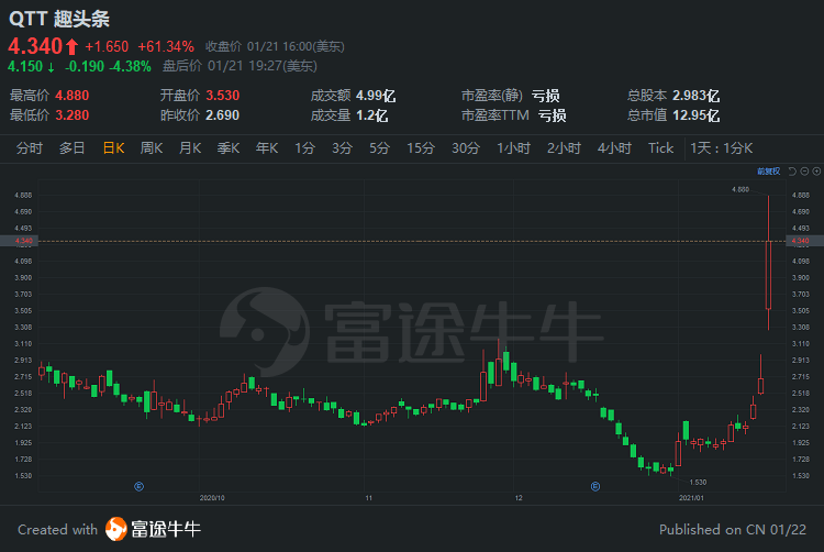 $趣头条(QTT.US)$周四收盘大涨61.34%,报4.34美元,盘中高见4.88美元创2020年3月16日以来新高,今年已累涨近173%。