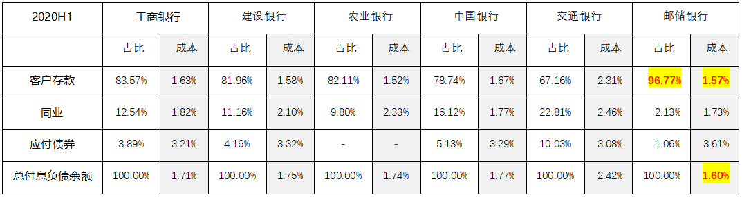 看各家银行用来投放信贷、投资等的“原材料”-付息负债中可以看到,邮储银行的客户存款占比达到97%,其他大行仅为80%左右。有好处也有坏处,好处是“低成本”的存款源源不断,缺点是不符合负债多样化的原则,严重依赖单一渠道。