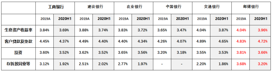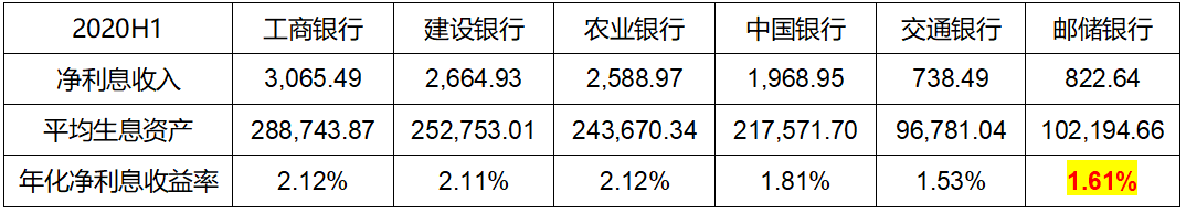 2020年中报,邮储银行的生息资产的总收益率是国有大行中最高的,且受疫情等冲击下,收益率下降的幅度是最少的,抗风险能力较强,特点是收益高,下滑少。