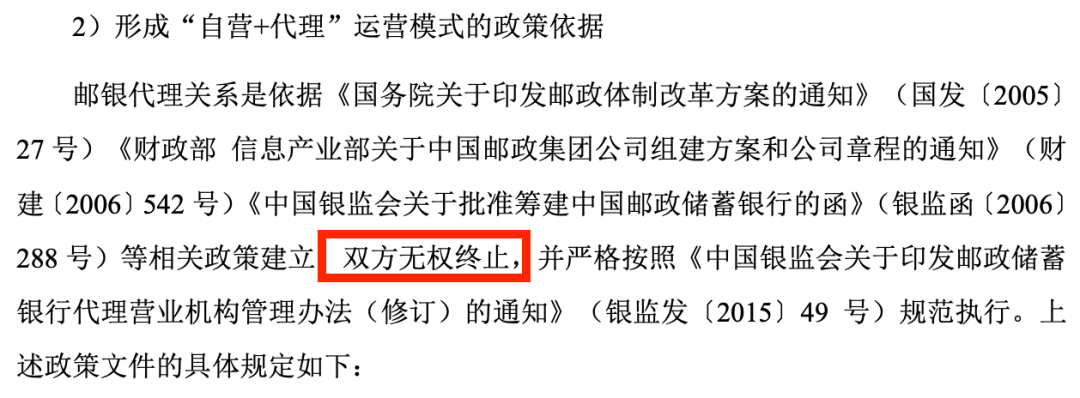 查看邮储银行的招股说明书,代理关系的决定权在国务院,双方无权终止。也未发现有明确说明这笔费用未来的某个时间会取消。